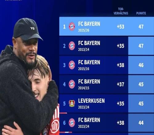 拜仁慕尼黑本赛季创下了德甲历史上半程最佳战绩纪录,德转列出了德甲历史上半场最佳战绩前十,拜仁独占八席,勒沃...