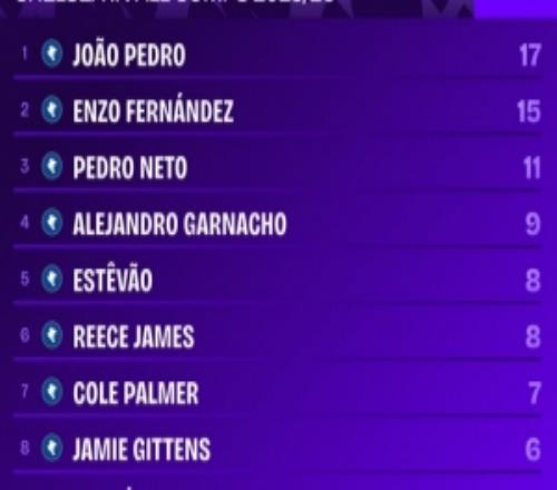 本赛季切尔西队内参与进球:若昂佩德罗17球最多,恩佐15球次席