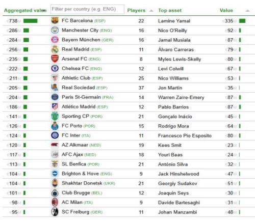 凭借亚马尔、库巴西、费尔明、奥尔莫、巴尔德、埃里克-加西亚、卡萨多、贝尔纳尔以及加维等一众球员的出色表现,巴萨以6.4亿英镑(约7.38亿欧元)的青训球员总身价高居榜首。